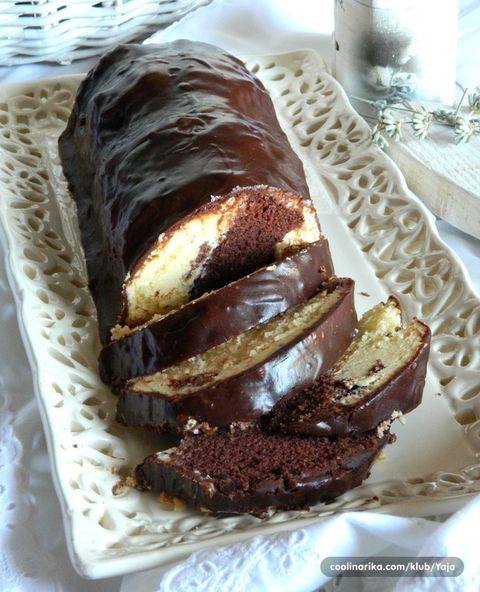 1 Žumanjke izraditi sa šećerom i dodati sve ostale sastojke. Snijeg od bjelanjaka dodati na kraju. Smijesu podijeliti u dva jednaka dijela. kako bi dobila približno iste dijelove, sa šefljom sam naizmjence stavljala dio u protvan u kojem se peče, a dio u posudu.