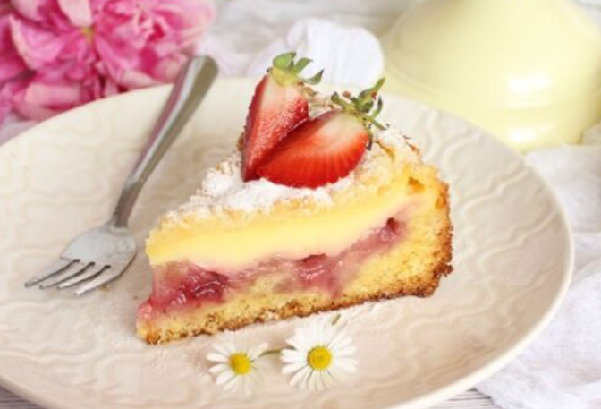Pripremljeno tijesto u hrpicama stavite na dno kalupa pa žlicom sve lijepo poravnajte. Preko tijesta posložite na ploške narezane jagode, a preko jagoda kuhani puding od vanilije.Puding od vanilije skuhajte prema uputama na pakiranju i odmah, dok je vrući prelijte preko nadjeva od jabuka.