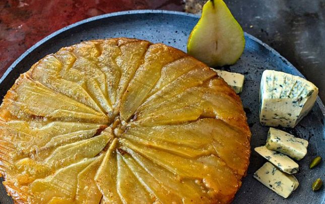 Kruške oprati i izrezati na tanje šnite uzdužno. Maslac rastopiti na laganoj vatri stalno miješajući, maknuti ga s vatre pa dodati med i miješati dok se smjesa ne ujedini. Izliti smjesu u kalup za tortu pa po mješavini meda i maslaca poslagati kruške u krug, deblji dio neka ide prema rubu kalupa, a tanji prema sredini. Ponoviti redove dok ima krušaka. U posudi izmiksati maslac, ulje, med, šećer, dodati prašak za pecivo, vaniliju, sol, kardamom, muškatni oraščić. Ubaciti jedno po jedno jaje pa jednu šalicu brašna pa mlaćenicu pa drugu šalicu brašna i dobro izmiksati. Na kraju umiješati orahe i smjesu rasporediti u kalup po kruškama. Peći na 160 stupnjeva oko 40 minuta. Kolač se mora hladiti 20 do 30 minuta prije nego što se izvadi iz kalupa i preokrene, u sredinu staviti gorgonzolu ili servirati sir sa strane.
