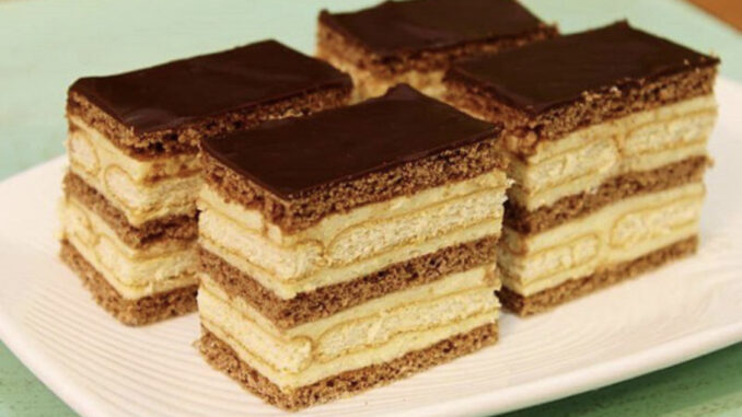 1. Kora – krema – keks – krema 2. Kora – krema – keks – krema 3. Kora – čokoladna glazura 4. Kolač ostavite u frižideru da prenoći i tako da omekani. Prije rezanja neka odstoji na sobnoj temperaturi nekih 15 min, tako da se čokolada reže bez pucanja.