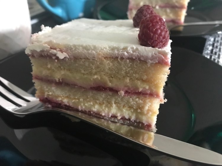 Slaganje: korica- pola kreme od malina- pola krema od vanile- korica- krema od malina- krema od vanile . – kada se stavi prvi krem od malina staviti kolač u frižider na par minuta – ukrasiti po želji.