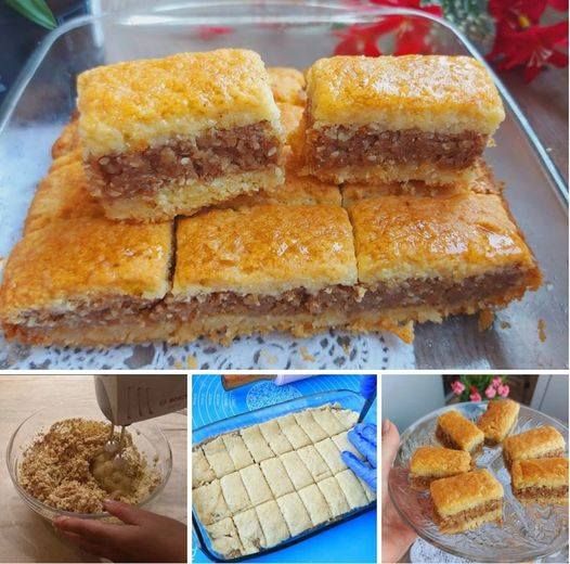 Uzmite prvi dio tijesta i poravnajte ga valjkom koji odgovara dimenzijama lima za pečenje. Ovo spljošteno tijesto stavite na dno. Pomiješajte orahe, šećer u prahu, sezam, cimet i vrhnje. Zaseban manji komad tijesta umiješajte u smjesu, pazeći da se rukama dobro izmijesi.
