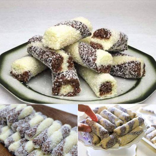 Ostavite da se smese ohlade(ne da se stegnu), razvucite na pek papiru beli deo uz pomoć oklagije, na drugom pek papiru razvucite tamni deo i potom preklopite testa jedno preko drugog. Pređite oklagijom da se delovi spoje. Secite trake širine oko 1 cm. urolajte i uvrnite da se naprave šare (možete pogledati u videu). Secite manje komade i uvaljajte u kokos. Ostavite kolače u frižideru da se stegnu. Prijatno!