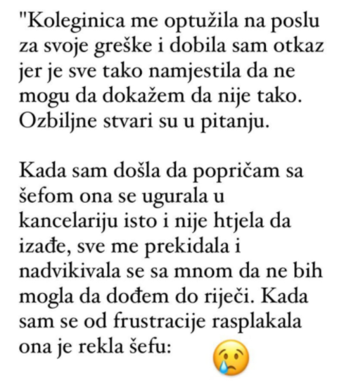 Kada sam došla da popričam sa šefom ona se ugurala u kancelariju isto i nije htjela da izađe, sve me prekidala i nadvikivala se sa mnom da ne bih mogla da dođem do riječi. Kada sam se od frustracije rasplakala ona je rekla šefu: