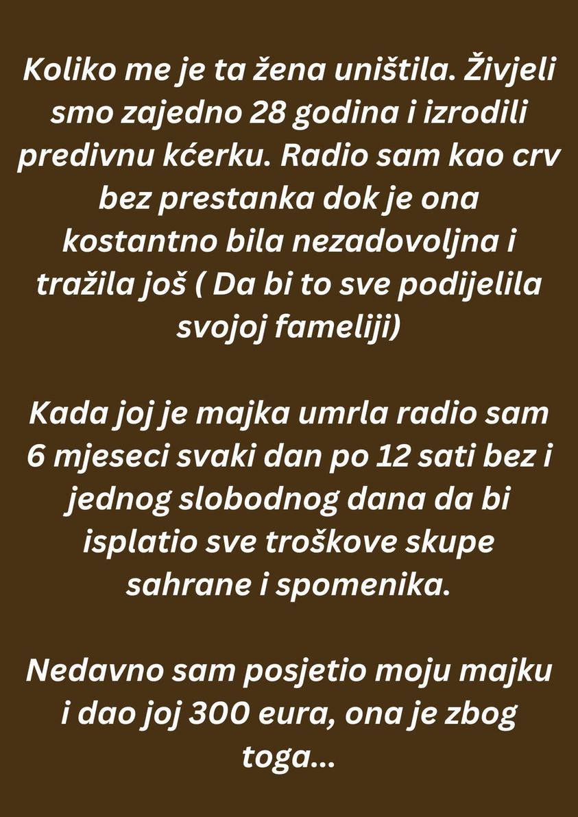 Koliko me je ta žena uništila. Živjeli smo zajedno 28 godina i izrodili predivnu kćerku. Radio sam kao crv bez prestanka dok je ona kostantno bila nezadovoljna i tražila još ( Da bi to sve podijelila svojoj fameliji)