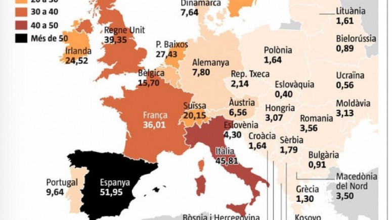 Fotografija mape Evrope, koju su objavili španski mediji, pokazuje da u Evropi Španija ima najveću stopu smrtnosti od skoro 52 osobe na 100 hiljada stanovnika.