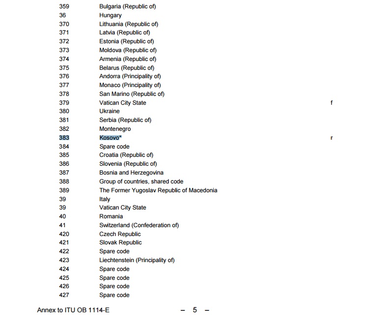 Ministarka za dijalog u Vladi Kosova Edita Tahiri saopštila je danas da je Kosovu i zvanično dodjeljen pozivni broj 383 od Međunarodne telekomunikacijske unije. Unija je takođe objavila pozivni broj za Kosovo.