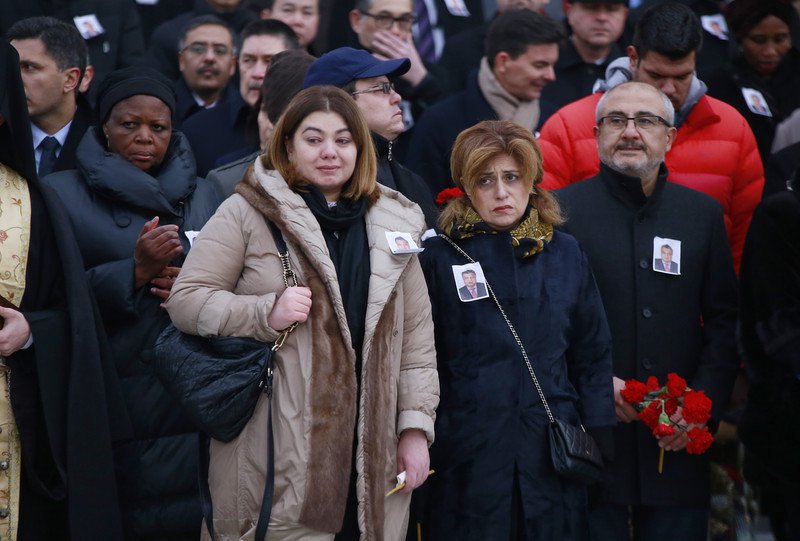Prisutni na ispraćaju su na reverima kaputa nosili fotografiju ubijenog ruskog diplomate.
