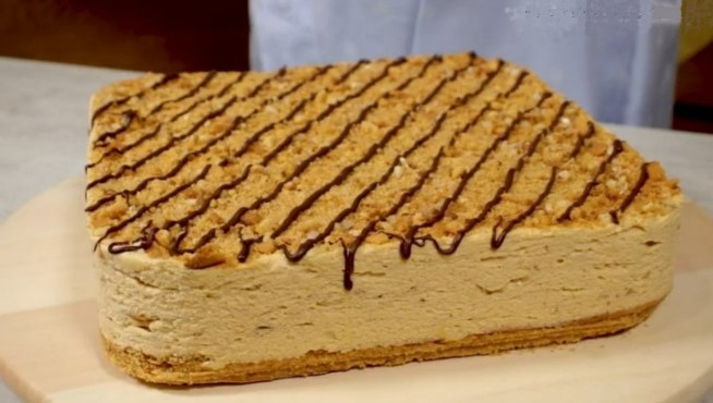 Kako biste napravili tortu stavite u posudu maslac, med, šećer u prahu i zagrevajte na blagoj vatri dok se potpuno ne otopi, mešajući povremeno. U smesu dodajte kašiku sode bikarbone prethodno pokašane i promešane sa kašičicom sirćeta. Nakon dodavanja sode sa sirćetom nastavite da mešate na blagoj temperaturi. Smesu kuvajte dok ne dobije tamnonarandžastu boju, a potom skinite sa vatre i ostavite da odstoji 5 minuta. Povremeno mešajte, a zatim dodajte umućena jaja.