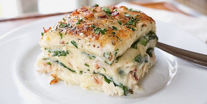 Na dno vatrostalne posude sipajte tanak sloj sosa, na sos poslažite 4 komada obarene testenine pa sve zalijte sa još jednim slojem sosa. Na soso sipajte polovinu piletine, oko 1 šolju naribanog parmezana i jednu šolju mocarele, a zatim dodajte polovinu listova spanaća i 1/3 pržene slanine. Sve prekrijte sa još 4 komada testenine pa ponovite postupak.