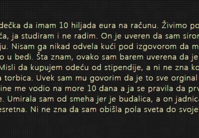 “Krijem od dečka da imam 10 hiljada eura na računu. Živimo pod kirijom, on sve plaća, ja studiram i ne radim.