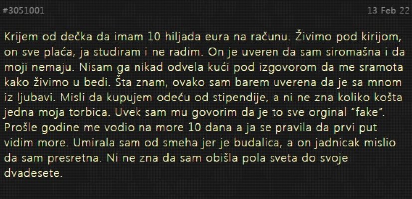 “Krijem od dečka da imam 10 hiljada eura na računu. Živimo pod kirijom, on sve plaća, ja studiram i ne radim.