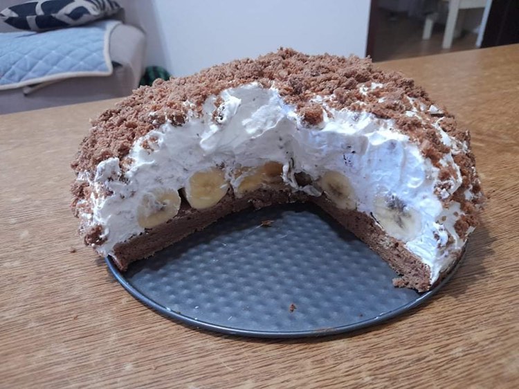 Ohladjenu koru preseći tako da vam dole ostane oko 1,5 cm a ostatak je za posipanje odgore.Preliti sirupom koru staviti banane ili tanko premazati kremom i preko banana u poluloptu premazati krem.Ostatak kore izmrviti i posuti preko krema i blago rukama utisnuti komadiće da ne bi padali.