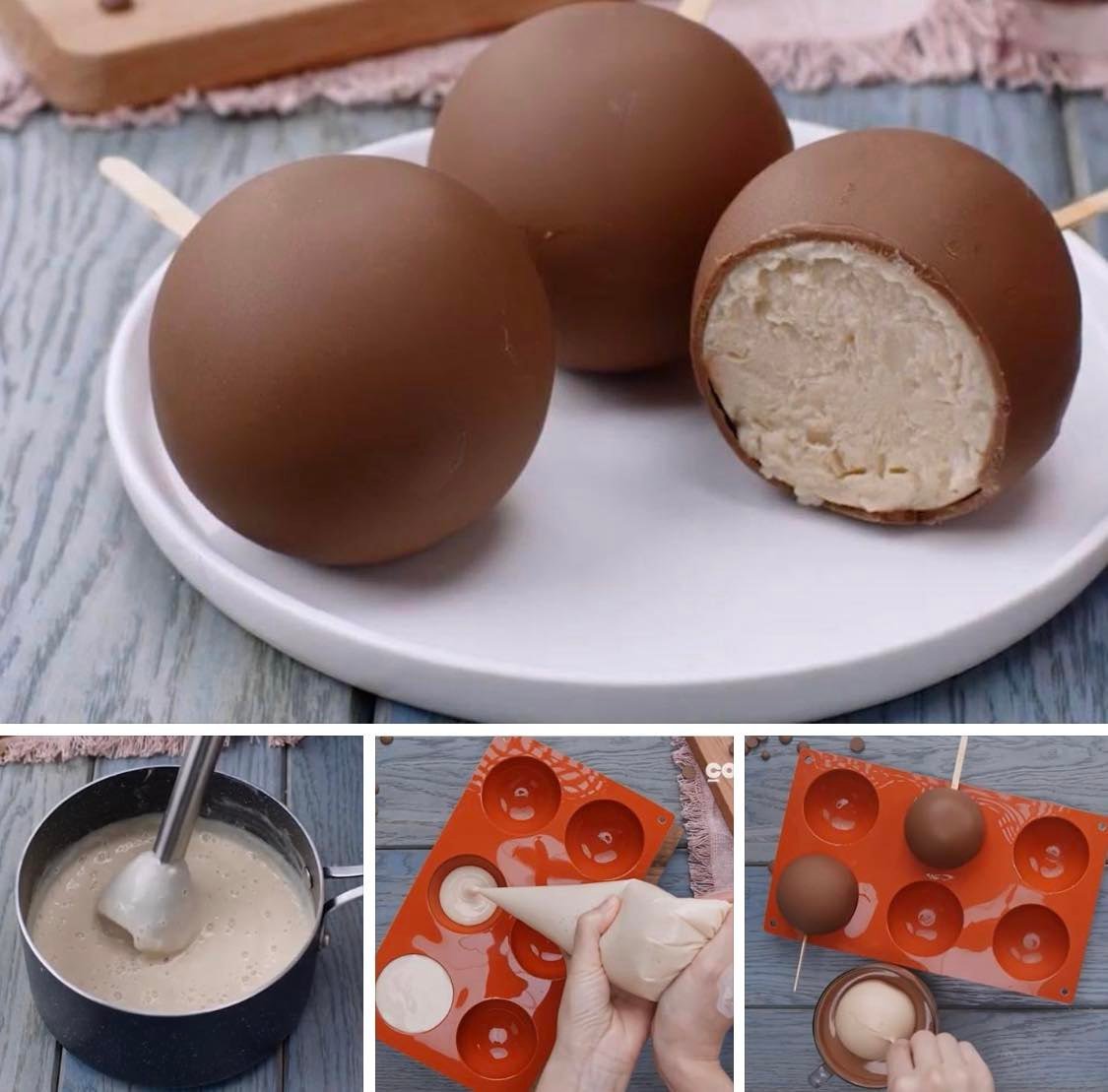 Ostavite da se ohladi i izmiksajte. Prebacite u silikonski pleh za mafine u obliku polukrugova i zamrznite 2 sata. Na polovinu loptica stavite štapiće za sladoled, a na druge polovine istisnite malo smese pa zalepite da dobijete lopticu. Zamrznite još 1 sat. Umočite svaku lopticu u otopljenu čokoladu i zamrznite još 30 minuta.