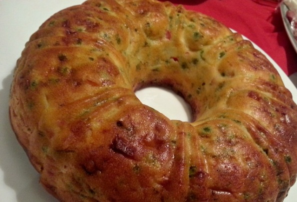 3. Modlu za kuglof bogato nauljiti ili premazati puterom, obložiti pršutom tako da se preklapaju i polovina pršute ostane sa spoljne strane kalupa.