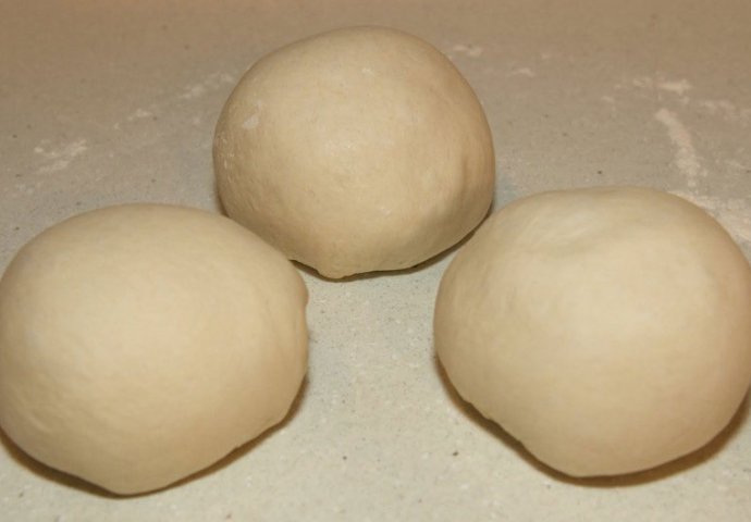 Manje dijelove polako razvući prstima, bez oklagije, na željenu veličinu i debljinu. Tako ćete dobiti 3-4 pice.