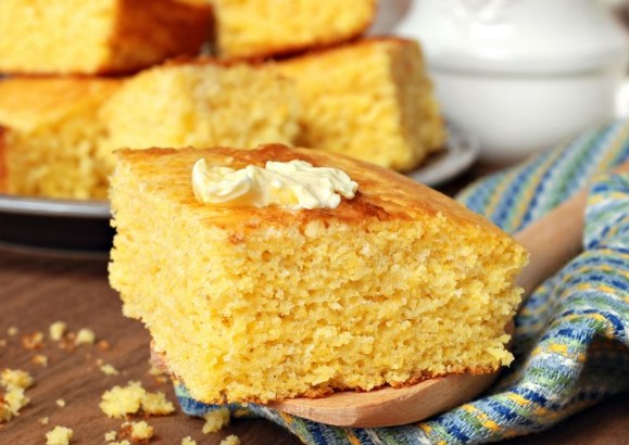 U dobivenu smjesu ubacite kukuruzno brašno, dobro promiješajte i onda smjesu ulijte u protvan. Stavite ga u zagrijanu pećnicu i pecite između 20 i 30 minuta. Kolač je gotov kad na površini poprimi zlatno-žutu boju i kad se odvoji od rubova protvana.