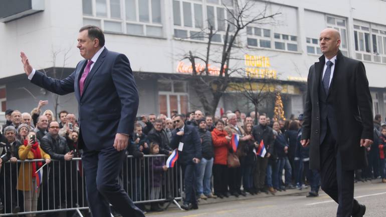 Pre početka defilea pomalo humorna scena. Idući prema svečanoj pozornici, Dodik, u pratnji čoveka koji je valjda njegov lični pratilac, išao je sredinom ulice pozdravljajući “republikance” s obe strane – čas levom, čas desnom rukom. Na svečanoj bini, kao i prošle godine, izostala je prva “srpska faca” – Aleksandar Vučić, ali i premijerka Srbije Ana Brnabić. Ministar spoljnih poslova Ivica Dačić nekoliko dana ranije rekao je da “ima obaveze u Beogradu”, ne pominjući da je, možda, zakazao kakav koncert.