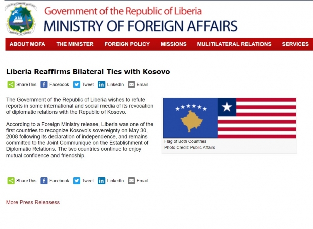 Kosovsko ministarstvo je kao dokaz postavilo link na zvaničnoj internet-stranici Ministarstva spoljnih poslova Liberije.