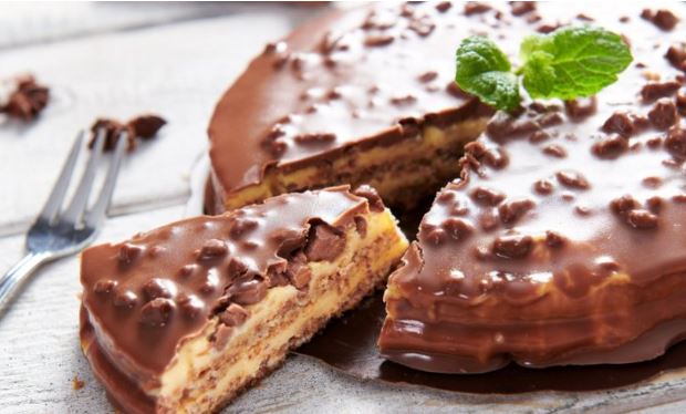 Zamrznuti kolač izvadite iz kalupa pa ga ukrasite rastopljenom čokoladom koristeći kašiku (čokoladu pomoću kašike pokapajte preko kolača). Pospite sa seckanim lešnicima, izrežite na kocke željene veličine i odmah poslužite.
