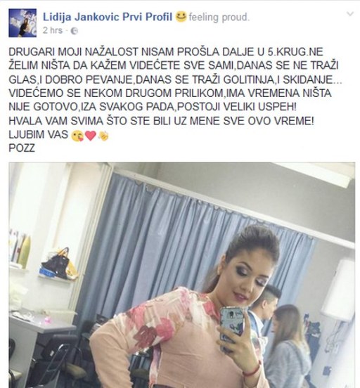 Na svom fejsbuk profilu objavila je kako nije prošla te da na Zvezdama Granda se više ne traži glas i dobro pjevanje, nego golotinja i skidanje.