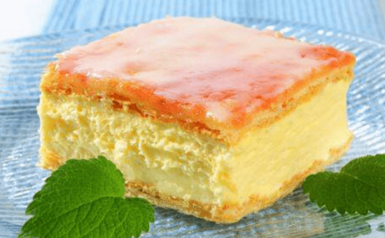 Za fil penasto umutite sir, šećer, pavlaku i vanillin šećer. Dodajte koru i sok limuna. Prvi deo stavite u podmazanu tepsiju i poravnajte ga kašikom. Odozgo stavite fil, a preko fila drugi deo testa takođe poravnajte kašikom.
