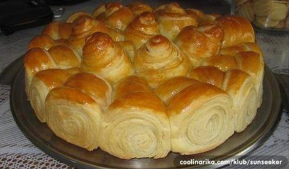 Nadošlo tijesto premijesiti na pobrašnjenoj radnoj površini , podijeliti na 5 jednakih dijelova i od svakog napraviti lopticu. Ostaviti 10 min. da se odmore.