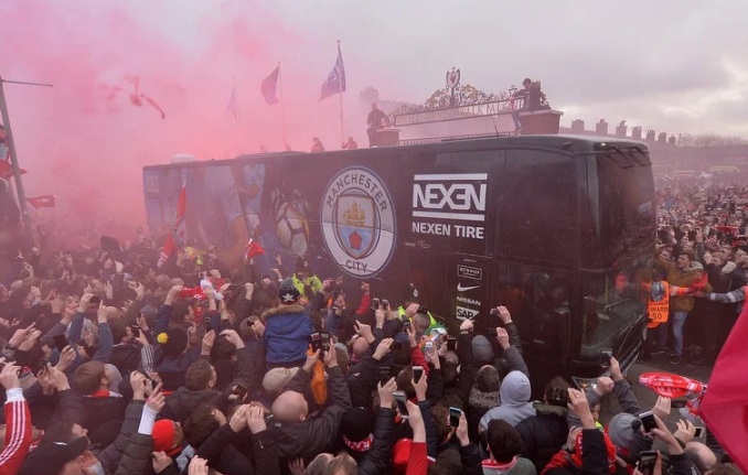 “Autobus igrača Manchester Cityja je bio meta različitih ‘projektila’ dok je usporavao kako bi skrenuo na uglu ulica Arkles Lane i Anfield Road, gdje je bila okupljena većina navijača. Zapaljene su baklje zbog čega je vidljivost bila slaba, a navijači su preplavili ulice oko stadiona. Liverpoolov autobus je stigao nešto kasnije”, navodi se u izvještaju BBC-jevog dopisnika.