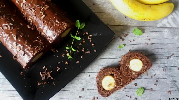 Na kraju dodajte maslac. Zagrijte rernu na 180 stepeni i pecite biskvit 20 minuta. Ostavite ga da se ohladi i nakon toga premažite kremom. Banane rasporedite na dvije strane. Zamotajte roladu, premažite ostatkom kreme i ostavite da se ohladi.