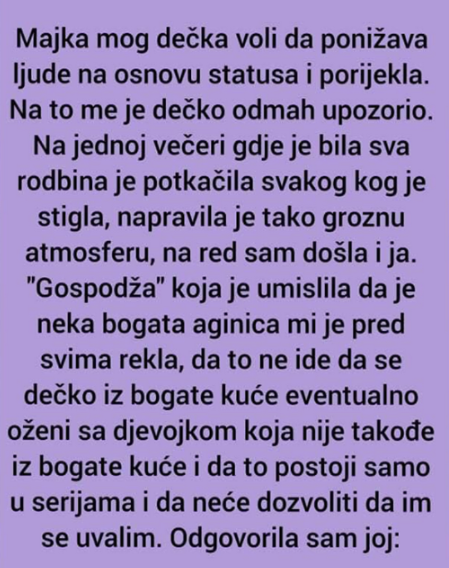 Na to me je dečko odmah upozorio. Na jednoj večeri gdje je bila sva rodbina je potkačila svakog kog je stigla, napravila je tako groznu atmosferu, na red sam došla i ja. “Gospodža” koja je umislila da je neka bogata aginica mi je pred svima rekla, da to ne ide da se dečko iz bogate kuće eventualno oženi sa djevojkom koja nije takođe iz bogate kuće i da to postoji samo u serijama i da neće dozvoliti da im se uvalim.