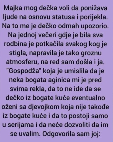 Na to me je dečko odmah upozorio. Na jednoj večeri gdje je bila sva rodbina je potkačila svakog kog je stigla, napravila je tako groznu atmosferu, na red sam došla i ja. “Gospodža” koja je umislila da je neka bogata aginica mi je pred svima rekla, da to ne ide da se dečko iz bogate kuće eventualno oženi sa djevojkom koja nije takođe iz bogate kuće i da to postoji samo u serijama i da neće dozvoliti da im se uvalim.