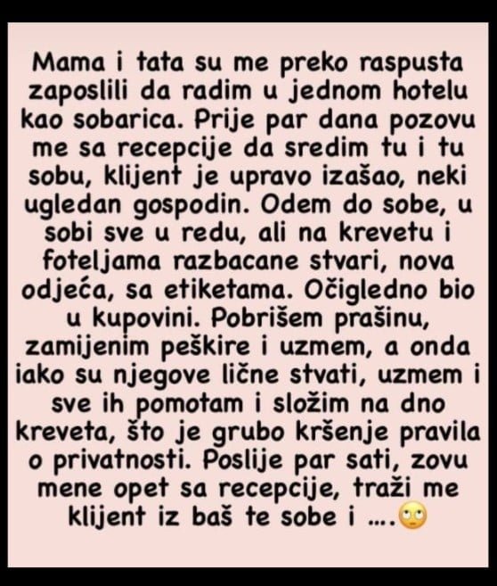 Pobrišem prašinu, zamijenim peškire i uzmem, a onda iako su njegove lične stvati, uzmem i sve ih pomotam i složim na dno kreveta, što je grubo kršenje pravila o privatnosti. Poslije par sati, zovu mene opet sa recepcije, traži me klijent iz baš te sobe.