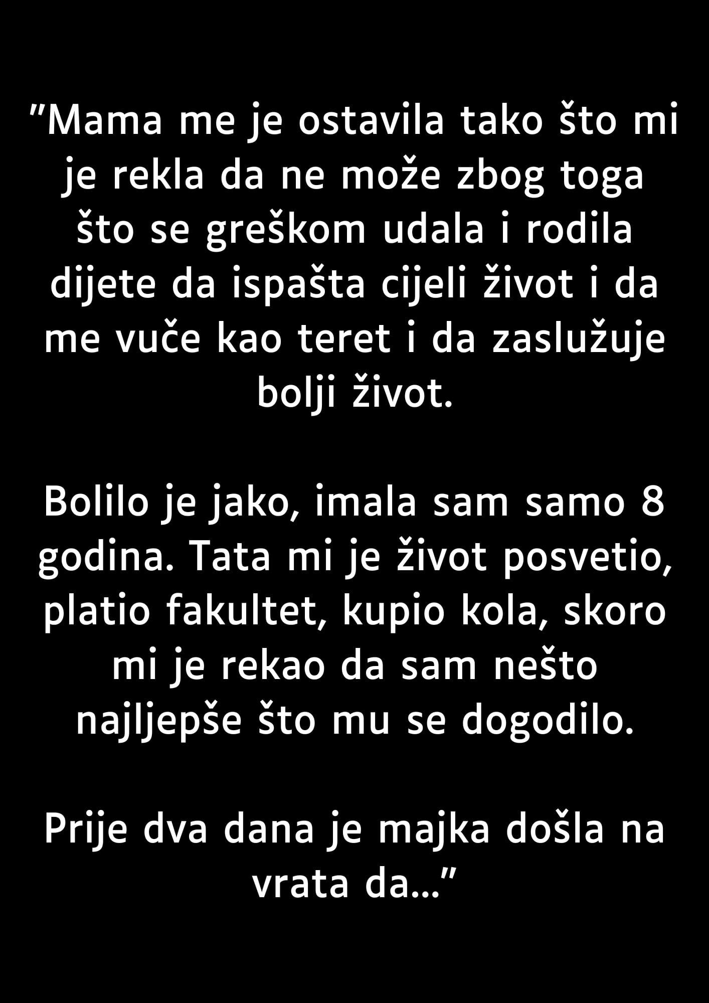 “Mama me je ostavila tako što mi je rekla da ne može zbog toga što se greškom udala i rodila dijete da ispašta cijeli život i da me vuče kao teret i da zaslužuje bolji život.