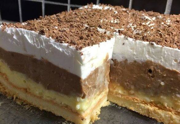 Pomesati margarin i miksati sa pudingom od vanile a drugi isto to uraditi sa pudingom od cokolade. Pokvasenu koru premazati belim kremom a onda braon kremom i na kraju staviti slag odozgo i izrendati cokoladu…