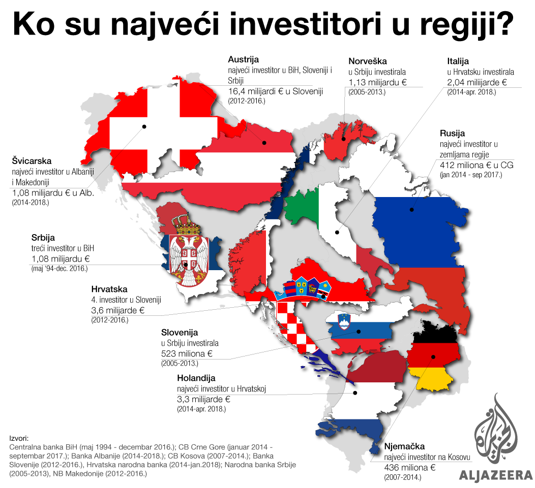 Prema podacima centralnih banaka zemalja regije, najveći investitor u petogodišnjem periodu u regiji je Rusija, zatim slijede Austrija i Norveška.