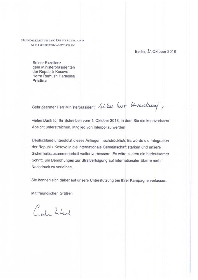 “To potvrđuje pismo kancelarke Angela Merkel koje sam danas dobio preko ambasadora Kristijana Helta. Snažna podrška Njemačke članstvu Kosova u Interpol dolazi u ključnom trenutku za međunarodnu konsolidaciju naše zemlje”, napisao je Haradinaj na svom Facebook profilu.