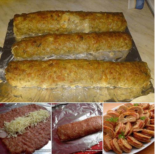 U cinju staviti mleveno meso, dodati zacine, ispasiran beli luk, jaje i prezle i dobro sjediniti smesu. U posebnu cinju izrendati mozzarellu. Od alufolije napraviti pravougaonik i nauljiti ga. Preko folije staviti meso i rastanjiti ga na debljinu prsta. Na sredini staviti tanko isecenu pecenicu i preko nje izrendani sir.