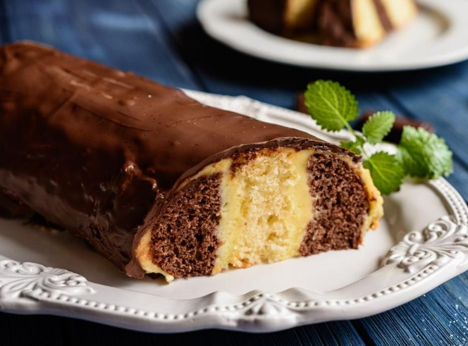 Složite kolač.Na ravnoj površini, naizmjenično slažite tamne i svijetle slojeve biskvita, izmjenjujući ih. Između svakog sloja nanesite pripremljeni nadjev. Također, prekrijte cijeli kolač preostalim nadjevom.