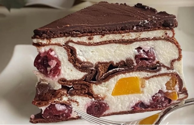 Palačinku na dnu obilno premažite kremom. Složite ostale palačinke poput vrećica jednu do druge, a prostor između njih obilno popunite kremom od sira i voća. Kad ste iskoristili sve palačinke, “zacementirajte” ih ostatkom kreme. Na kraju stavite završnu palačinku. Poravnajte i obložite folijom.