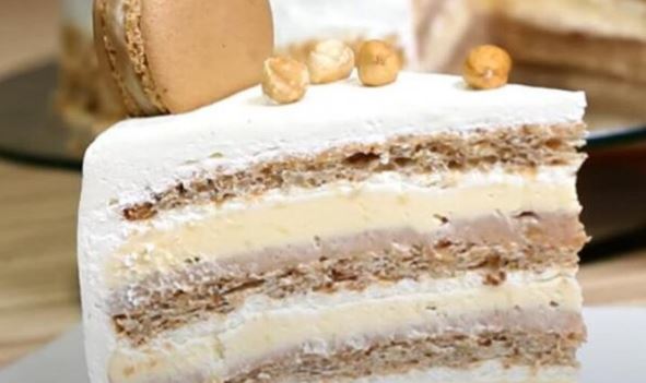Kora: 4 belanca umutite sa postepenim dodavanjem šećera. Sjedinite 4 kašike mlevenih lešnika i kašiku brašna, pa dodajte u umućena belanca. Promešajte lagano i sipajte u okrugli kalup veličine 26 cm. Pecite u zagrejanoj rerni na 200 °S oko 15 minuta ili zavisno od vaše rerne. Na isti način pripremite i preostale 3 kore.
