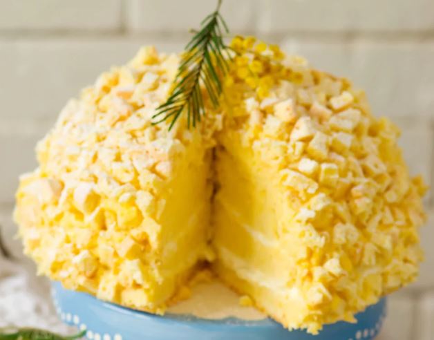 Zadnju koru narežite na sitne kockice i zalijepite po cijeloj površini torte. Tako ćete dobiti efekt cvijeta mimoze. Kockice biskvita poprskajte sirupom.Ohladite nekoliko sati i prije posluživanja pospite šećerom u prahu.