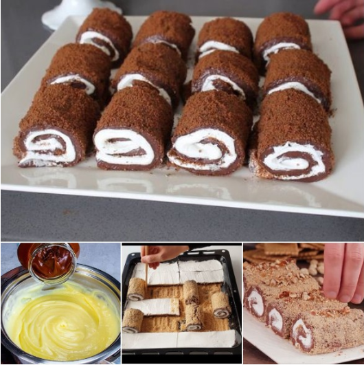 Poravnajte i stavite u frižider na pola sata. Izvadite, isecite, pa pospite mlevenim lešnicima (50 g), pa svako parče urolajte.