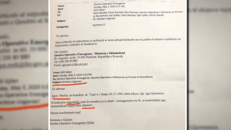 Posle tragičnog gubitka života 26-godišnjaka iz Gnjilana Agona Musljiua, koji je skočio sa zgrade Studentskog centra u Prištini, gde je bio u karantinu, televizija Kljan Kosova je objavila dokumenta, odnosno zahteve upućene Operativnom centru Ministarstva unutrašnjih poslova.