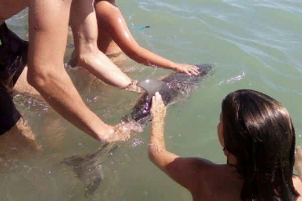 Mali delfin nasukao se u plićaku nedaleko od plaže krcate turistima na jugu Španije. Turisti su se uskoro okupili oko delfina kako bi ga mazili i fotografisali se pored njega.