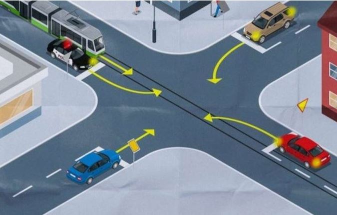 Ulicom bez prava prvenstva prolaza kreću se tramvaj koji produžava pravo, policijisko vozilo pod rotacijom koje skreće lijevo i, iz suprotnog pravca, crveni automobil koji skreće lijevo.