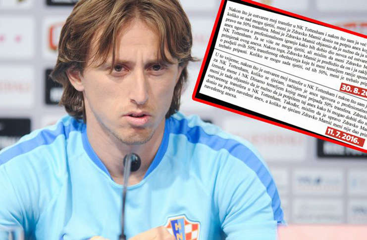 “Nakon što je ostvaren moj transfer u Tottenham i nakon što sam ja već igrao za taj klub, koliko se sada mogu sjetiti, meni je Zdravko Mamić donio na potpis aneks kojim meni pripada pravo na 50 posto transfera. Meni je Mamić objasnio da je nužno da sada potpišem taj aneks ugovora o profesionalnom igranju kako bih dobio dio novca od ostvarenoga transfera u Tottenham. Nakon toga Mamić je predložio da on i ja zaključimo ugovor o podjeli ovih 50 posto transfernoga obeštećenja koje bi meni temeljem ranije spomenutoga aneksa trebalo pripasti. Koliko se sada mogu sjetiti, od tih 50 posto, meni je trebalo pripasti 23, a Zdravku Mamiću 77 posto”, objavio je Jutarnji list dio Modrićevog iskaza USKOK-u.