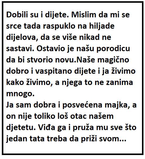 Dobili su i dijete. Mislim da mi se srce tada raspuklo na hiljade dijelova, da se više nikad ne sastavi. Ostavio je našu porodicu da bi stvorio novu.Naše magično dobro i vaspitano dijete i ja živimo kako živimo, a njega to ne zanima mnogo.Ja sam dobra i posvećena majka, a on nije toliko loš otac našem djetetu. Viđa ga i pruža mu sve što jedan tata treba da priži svom djetetu (jer je u mogućnosti).