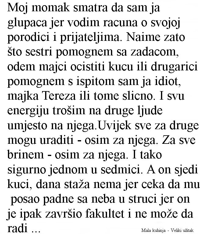 Moj momak smatra da sam ja glupača jer vodim računa o svojoj porodici i prijateljima. Naime zato što sestri pomognem sa zadaćom, odem majci očistiti kuću ili drugarici pomognem s ispitom sam ja idiot, majka Tereza ili tome slično. I svu energiju trošim na druge ljude umjesto na njega. Uvijek sve za druge mogu uraditi – osim za njega. Za sve brinem – osim za njega. I tako sigurno jednom u sedmici. A on sjedi kući, dana staža nema jer čeka da mu posao padne sa neba u struci jer on je ipak završio fakultet i ne može da radi bilo šta, živi kod roditelja sa svojih skoro 30 godina, od majke traži novce za kafu i cigare i tako u nedogled. Zajedno smo još od srednje škole i uvijek sam ga smatrala za dobrog i perspektivnog mladića u kojeg je vrijedilo ulagati. Kažem vrijedilo, nekad davno. Kad sam sve stavila na papir i pogledala koliko koraka idem ispred njega, osvijestila sam se da mi je on samo teret i da iz mene izvlači svu pozitivu koju sam imala. Zato je sada bivši.