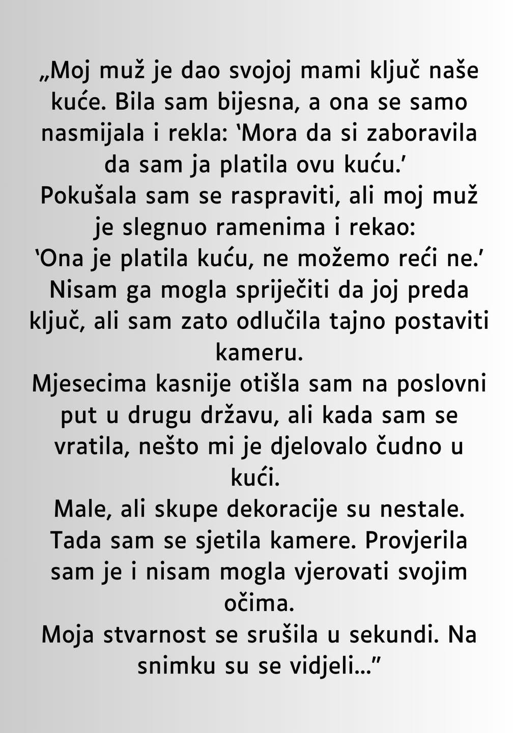 „Moj muž je dao svojoj mami ključ naše kuće. Bila sam bijesna, a ona se samo nasmijala i rekla: ‘Mora da si zaboravila da sam ja platila ovu kuću.’