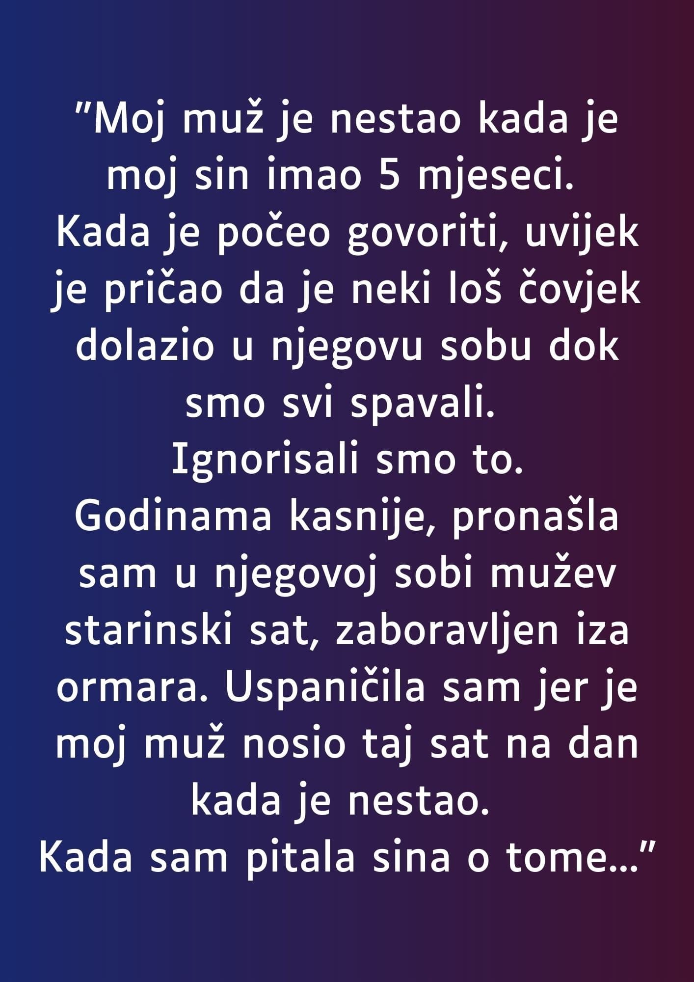 Godinama kasnije, pronašla sam u njegovoj sobi mužev starinski sat, zaboravljen iza ormara. Uspaničila sam jer je moj muž nosio taj sat na dan kada je nestao.